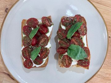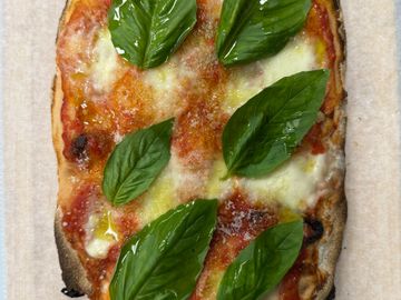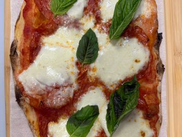 Pomodoro, fresh mozzarella fior di latte, Pecorino Romano, fresh basil, and extra virgin olive oil.