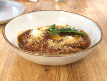 Homemade beef meatballs in marinara sauce, ricotta, topped with Parmigiano.
