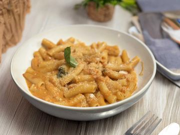 Maccheroni pasta, heavy cream, rich tomato sauce, Grana Padano.
