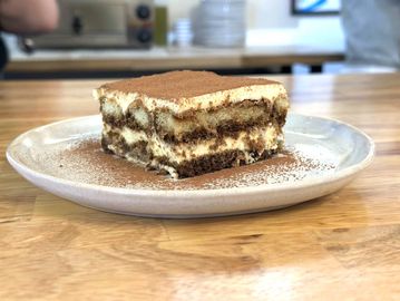 Alternating layers of ladyfinger cookies and mascarpone cream, finished with a dusting of cocoa powder.